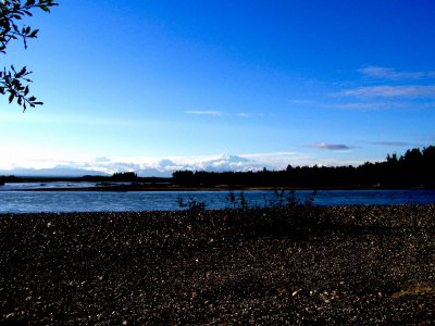 | Later the four of us took the tram the two miles to town. We walked through town and beyond to the river, where this view of the Alaskan Range greeted us. As the evening progressed we had some four cheese pizza. | ![]() |