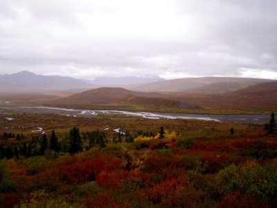 Saturday morning we took the train from Fairbanks to Denali. The ride was beautiful. The Traincar was wonderful. At Denali, we boarded a bus and drove through the National Park. Though the scenery was awesome, the driver went much too fast. |
