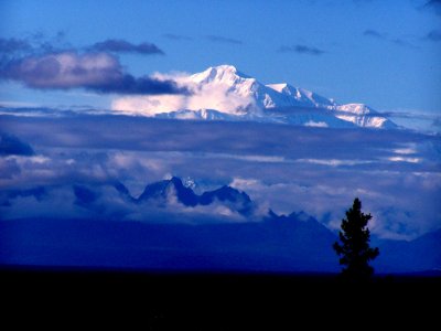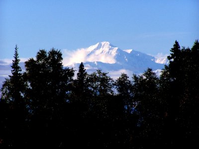 | The train stopped at Talkeetna, where we checked into the beautiful Talkeetna Lodge, perched on a hill two miles above Talkeetna. The view from our room window was the Alaskan Range and Mt. McKinley, the highest mountain in North America | ![]() |