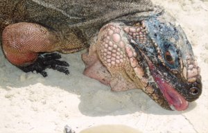 The Aquacat is one of Bruce Perdy's five liveaboards. It leaves from Paradise Island and travels through the northern Exumas for 6 days of diving. Our room was very comfortable featuring two large portholes, a King Size bed, plenty of closet space and a private bathroom with shower. My wife and I dove with the Aquacat July 12-19, 2003. 26 dives were available during the week. I made 24, skipping the dive on which I flooded my video camera and one dive for a land trip to swim with Lemon Sharks. We also had an interesting visit to Allen's Cay to visit friendly Iguanas. The Aquacat and Iguana pictures were taken by Bruce and Rondi Gordon.