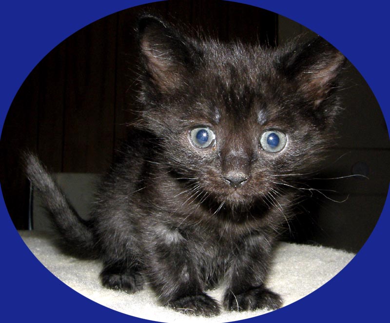 We returned home one day in October, 2007, and Tommy Holodick was sitting on our porch with a little black tiger dressed in a red bandana. We named him after Tommy, and he immediately joined the household. If anyone messed with the little guy, he hissed, and after two weeks he was fully accepted. He takes no guff from anyone, loves to cuddle, and eats 24 hours a day.