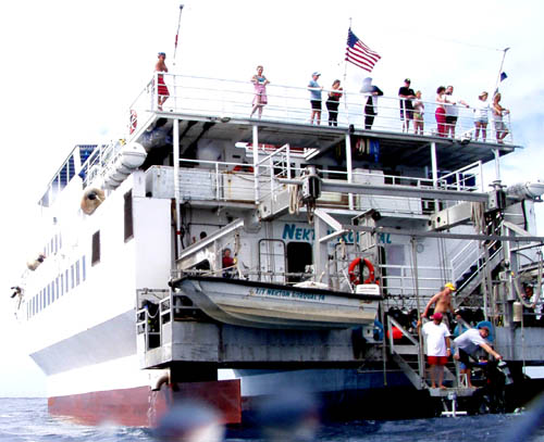 The Nekton Rorqual is the sister ship to the Nekton Pilot. Thanks to its unique design, I was able to survive on only 4 Triptones in 7 days. Our Mona Island adventure started in San Juan, where we traveled by van on a three hour trip to the port of Mayaquez. We made two stops; first for a snack at a Wendy's and then to a supermarket for alcoholic and carbonated drinks. We arrived at the dock around 9:30 PM. Many of the eleven crew members immediately came aboard the van and took all our luggage to our rooms. Chicken Cacciatore was waiting for us for dinner, followed by a general briefing.