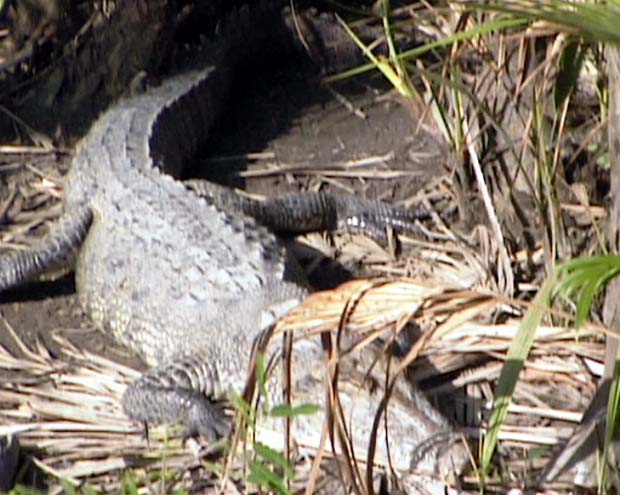 | As we round the corner, we cross over a little bridge above a pond. What's that lurking in the pond? Is it a friendly alligator? I don't think so. This South American Crocodile would eat you or me in two shakes of a Tapir's Tail, if he weren't so tired. Maybe we ought to move on. |  |