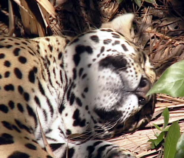 | Not far beyond the home of the Ocelot, we ran into the fabled god of the Maya. This beautiful sleeping baby is the Jaguar, the God of the Olmecs and the Maya. The Jaguar is the fastest animal in the Americas and possibly the most beautiful animal in the world. At the end of our story, there will be a link to the Official Belize Zoo site. There you can see many pix of the Jaguar in action. |