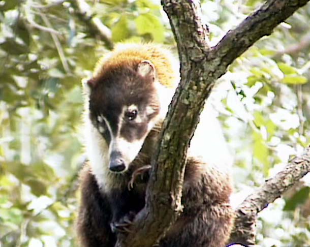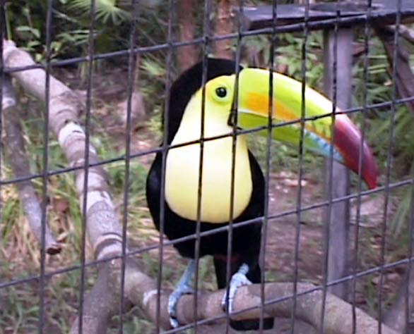 | Wow, I hope this little fellow is safe. Don't worry. I'm sure he can fly away from our friend, the crocodile in time. He gets great energy from his breakfast cereal. Yes, folks, this is the bird of Belize, the Toucan. He and his smaller cousins can be found in trees throughout the RainForest. |