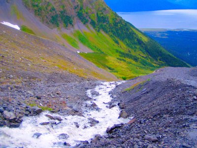 After dinner, I headed back up the tram to hike up the rest of the mountain. After a fifty minute climb, Randy and Sylvina Tucker and I made it to a pseudo glacier near Alyeska's Summit. The view and the experience were totally awesome. |