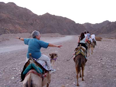 After King's City we rested for awhile at Coral Beach and then headed for our Camel Ride. The ride was followed by a sumptuous repast of many types of goat cheese prepared on the premises and tea. We rode with three very wealthy Russian American boys. Then back to Coral Beach for another rest before we drove to the border at midnight to get to Sharm El Sheikh, the Wildcat and the Red Sea.