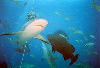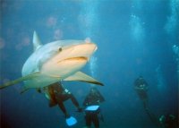 The next morning, we hiked to the top of Exuma Cay and then snorkeled with two Lemon Sharks. At 11:15 we entered the water again at Amberjack Reef. Dean brought down a Chumsickle tying it eight feet above a mooring on a large coral head. Many Sharks were watching. I have been on nine other choreographed Shark Dives in the last eleven years. This was by far the best, both for the divers and the sharks. On the next dive, we returned again to Amberjack Reef and hung around with 7 or 8 Caribbean Reef Sharks and a dozen or so Huge Groupers and Goliath Fish for about an hour. It was fascinating. None of these huge denizens of the sea were at all afraid of the divers and allowed us to hang around very closely and swim with them.