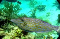 On the third night, I had one of the most exhilarating and frightening experiences of my life. I've been with hundreds of Sharks over the years, but none like this. My wife insists that I shined my light too close to the eyes of a Caribbean Reef Shark. All of a sudden, he bent in half and shot at my abdomen like a bullet. I jerked backward, and he caught me just below my BC inside my right hip. It felt like a very hard punch. My wife watched for two seconds and then resumed her nighttime hunt for little creatures. We saw two huge Goliath Groupers, a very large Scrawled Filefish, many lobsters and a Spider Crab on a Sea Fan. The highlight of the dive, (other than my being attacked,) was playing with a beautiful baby octopus for about 10 minutes. It was a fantastic dive!