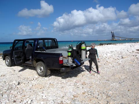 Just south of the Salt Pier, the first site is called Salt City. There is a large place to park. Walk through a little pool of coral rubble under the water and end up at a jagged edged flat surface on which to sit and enter. It's a long swim, but it's worth it. |