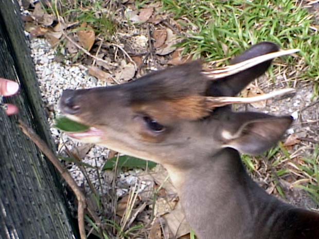 | Hey look. Here's one of the smallest deer I've ever seen. His color is so beautiful. He appears even smaller than the Key Deer I spent an evening with on Big PIne Key. We watched this beautiful Red Buck Deer eating this leaf. He was really friendly and loved to be petted. Hunters, put those things down! |  |